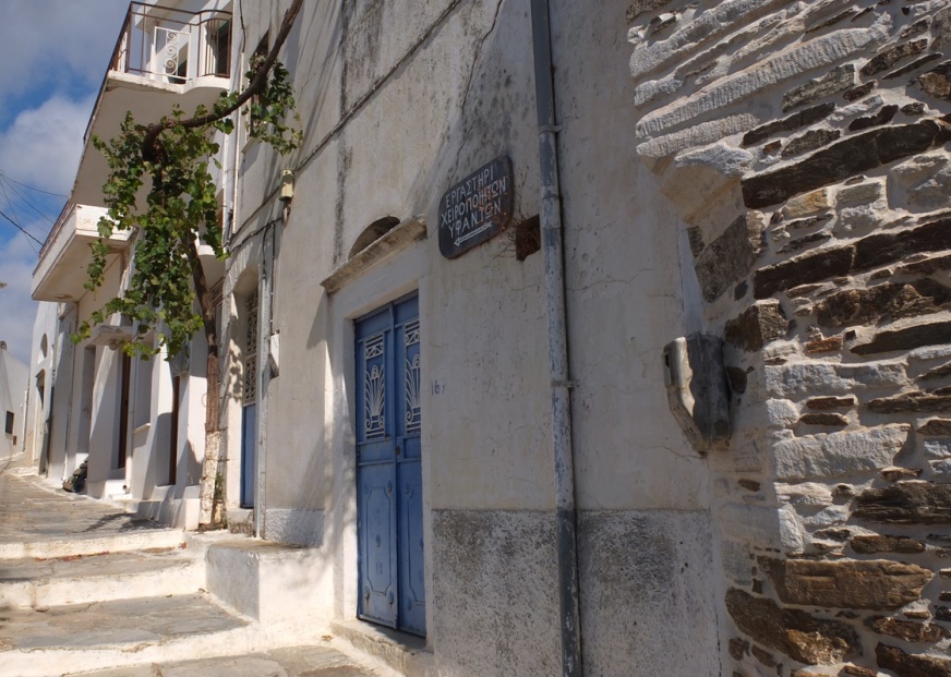 Leaving Chora, follow the sign towards “villages,” and you will quickly find yourself immersed in the mountains. Give yourself the freedom to stop off at one of the villages in the Tragea Valley and linger a while. Moni is an ideal stop. Located in the middle of the island and deep in the comfort of the valley, its quiet streets and homespun textiles provide a peek into another time. On your way out of town, stop at the Panagia Drossiani church from the 6th century and admire the frescos.