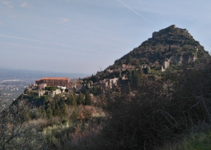 Nafpaktos town from above, with many traditional houses and the walls around the town