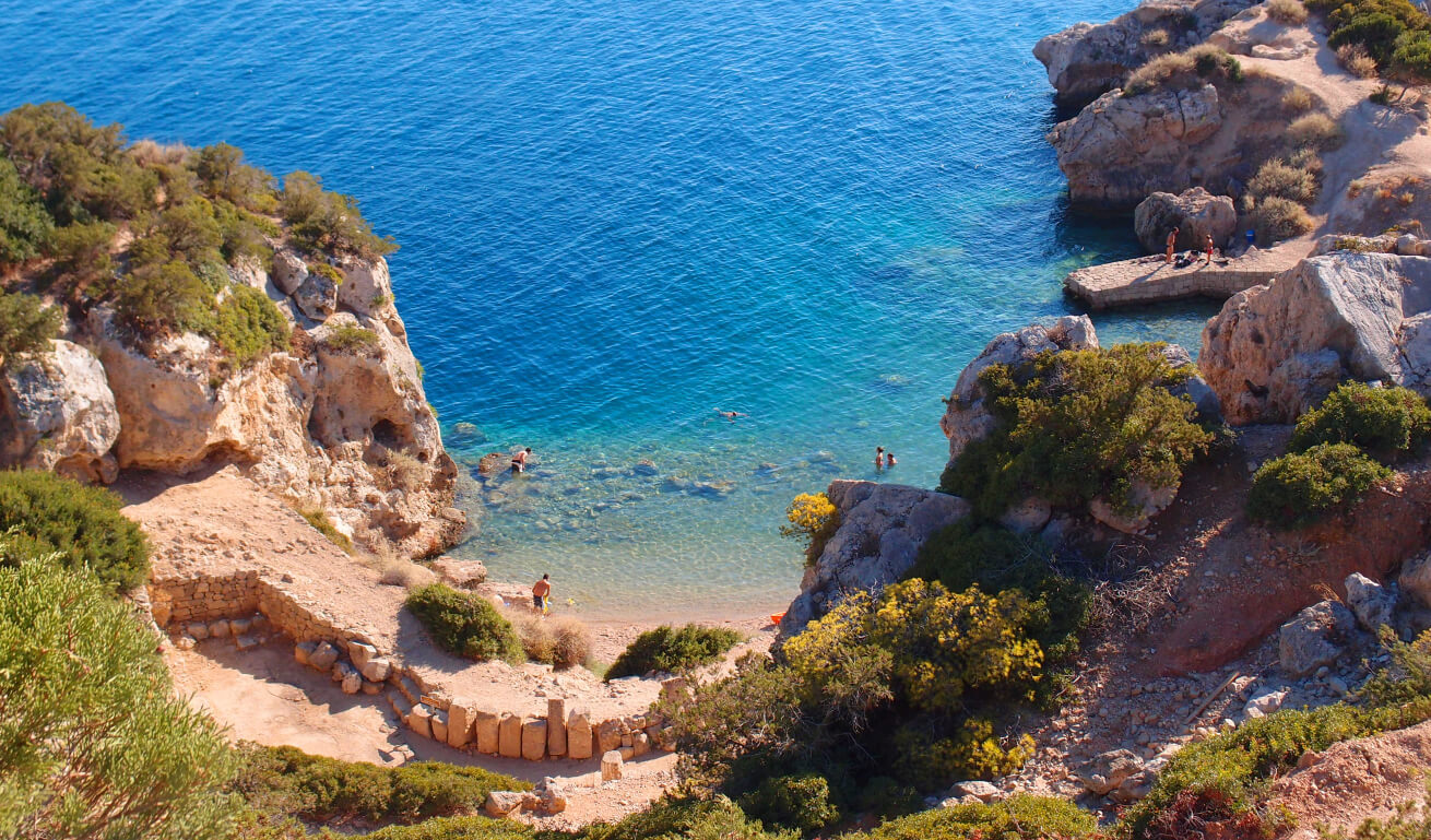 Built next to the picturesque bay and harbour you’ll encounter the Temple of Hera (first level of the site), making it ideal for a simultaneous refreshing dive in the sea found next to the site. The temple replaced an earlier small apsidal temple dating back to the Geometric period (late 9th century BC - early 8th century BC). The altar was a long rectangular structure, which was originally decorated with triglyphs and metopes on all four sides, while the remains of at least seven steps were part of a staircase. A two-storey stoa built in an L-shape, dating from the 4th century B.C., extends to the east of the Altar.