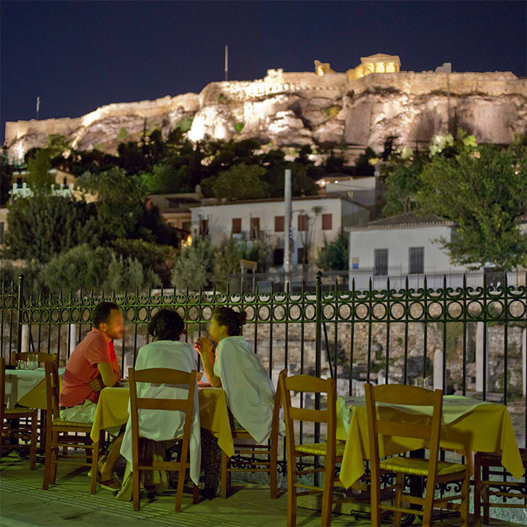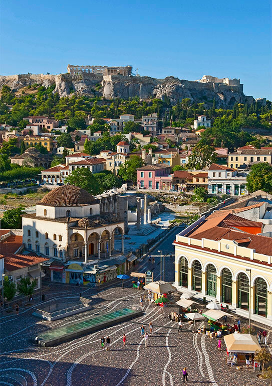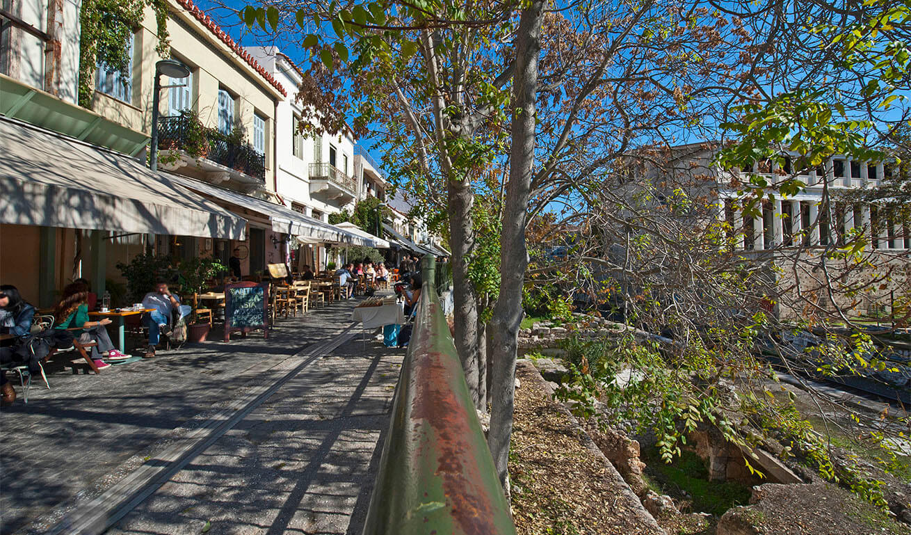 The “core” of the historic centre of Athens is the Plaka neighbourhood (at the eastern side of the Acropolis), which has been inhabited without interruption since antiquity. When you walk through the narrow labyrinthine streets lined with houses and mansions from the time of the Turkish occupation and the Neoclassical period (19th c.), you will have the impression of travelling with a “time machine”. You will encounter ancient monuments, such as the Lysikrates Monument, done by a wealthy donor of theatrical performances, the Roman Agora with the famed “Tower of the Winds” (1st c. B.C.) and Hadrian’s Library (132 A.D.), scores of bigger and smaller churches, true masterpieces of Byzantine art and architecture, as well as remnants of the Ottoman period (Fetihie Mosque, Tzistaraki Mosque, the Turkish Bath near the Tower of the Winds, the Muslim Seminary, et al.). There are also some interesting museums (Folk Art, Greek Children’s Art, Popular Musical Instruments, Frysira Art Gallery, etc.), lots of picturesque tavernas, cafés, bars, as well as shops selling souvenirs and traditional Greek products.
