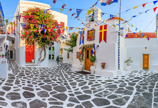 In ancient times, this seaside village was known as Agroikia. The present-day village is located in a small green valley that faces an enclosed cove fringed with a beautiful sandy shore where tamarisks grow. It looks more like a lake, with Tragonisi Islet at its mouth and flanked by two small peninsulas. It’s a 4.5 km trip SE from Chora.