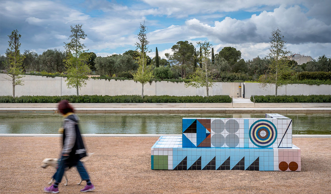 Πυρήνα της έκθεσης αποτελεί μία υπαίθρια σκηνή, σχεδιασμένη στην άκρα λεπτομέρεια, επενδεδυμένη με περισσότερα από 1.800 κεραμικά πλακίδια, τα οποία έχουν με προσοχή ζωγραφιστεί στο χέρι από την καλλιτέχνιδα στο studio της στο Βερολίνο. H Wieser, που έχει σπουδάσει ζωγραφική, αφήνει τα ίχνη από τις πινελιές της σε κάθε ένα από αυτά τα πλακίδια, τα ζωγραφισμένα με έντονα, λαμπερά χρώματα. Αυτό το μεγάλων διαστάσεων γλυπτό λειτουργεί τόσο ως σκηνή για παραστάσεις, όσο και σαν ένα δημόσιο σημείο συνάντησης, προσκαλώντας τους επισκέπτες να επιβραδύνουν τον ρυθμό τους και συνειδητά να παρατηρήσουν όσα τους περιβάλλουν. Είναι μια παρότρυνση προς όλους να παραμείνουμε ενεργά στο παρόν. Η γεωμετρική αυτή κατασκευή, στην οποία ενσωματώνεται και ένα μεγάλων διαστάσεων κάθισμα ενθαρρύνει την ανάπαυλα, αλλά και την ανταλλαγή ιδεών, αντλώντας έμπνευση από τον πλούτο της ιστορίας της τέχνης και του design -από τους δημοκρατικούς χώρους, τους αφιερωμένους στον διάλογο, της Ρωμαϊκής Αγοράς, αλλά και των θεάτρων της Αρχαίας Ελλάδας μέχρι και τις αρχές της αρχιτεκτονικές του Bauhaus.