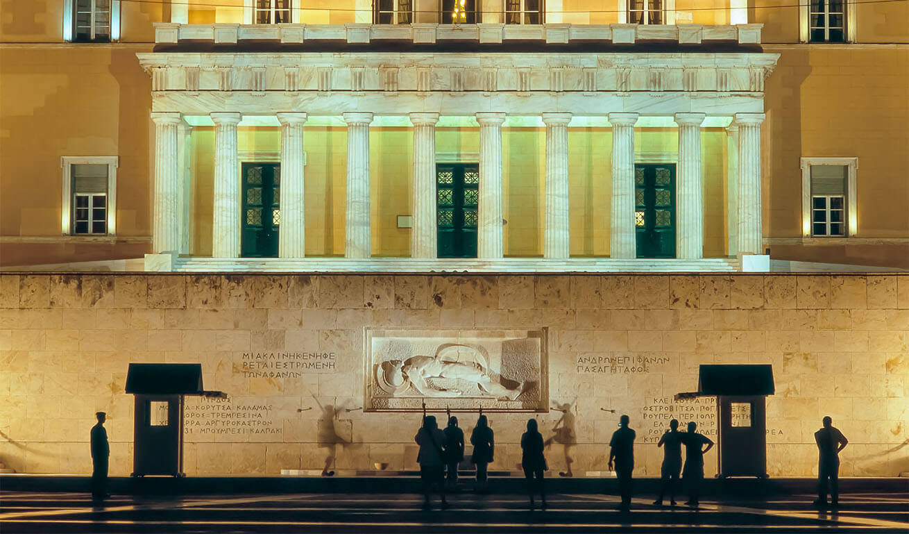 Ευζώνους, ενώ το τελετουργικό για την αλλαγή της φρουράς, πραγματοποιείται ανά ώρα. Μην χάσετε το μοναδικό θέαμα στις 11 πμ. κάθε Κυριακής, όταν η αλλαγή της φρουράς γίνεται με τη συνοδεία στρατιωτικής μπάντας και μεγάλου αγήματος Ευζώνων.