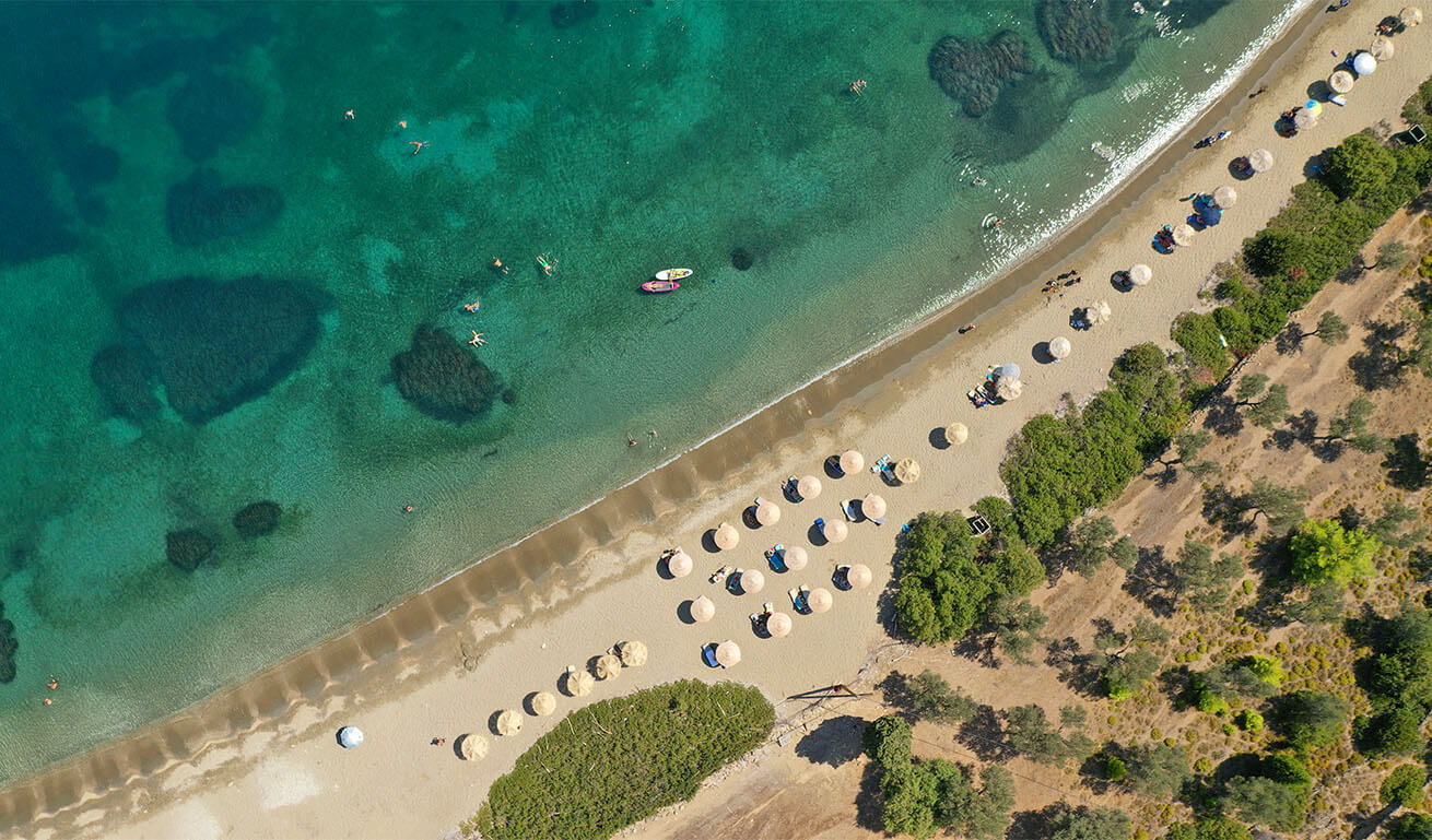 Surrounded by lush hills, Pefkos (meaning pine in Greek) beach justifies its name, as pine trees reach all the way to the beach, providing ample shade. The beautiful bay offers shelter from the winds.