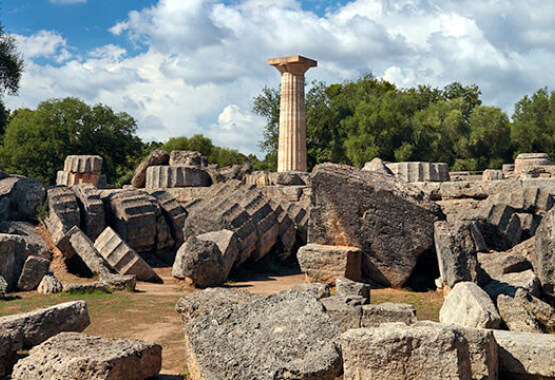 In the western Peloponnese, in the beautiful valley of the Alpheios river, lies the most celebrated sanctuary of ancient Greece. Dedicated to Zeus, the father of the gods, it lies on the southwest foot of Mount Kronios, at the confluence of the Alpheios and the Kladeos rivers, in a lush green landscape. Although secluded near the west coast of the Peloponnese, Olympia became the most important religious and athletic centre in Greece. Its fame rests upon the Olympic Games, the greatest national festival and a highly prestigious one world-wide, which was held every four years to honour Zeus. The origin of the festival goes back centuries. Local myths concerning the famous Pelops, the first ruler of the region, and the river Alpheios, betray the close ties between the sanctuary and both the East and West.According to UNESCO’s World Heritage website, there is probably no ancient archaeological site anywhere in the world more relevant in today’s world than Olympia. The stadium of Olympia, where the ancient Olympic Games were held, and the massive temple of Zeus, the largest temple in the Peloponnese, are the site’s most significant attractions.