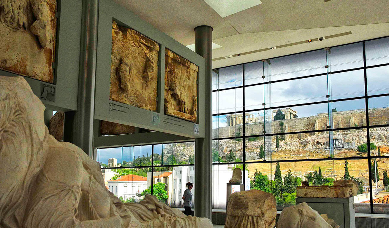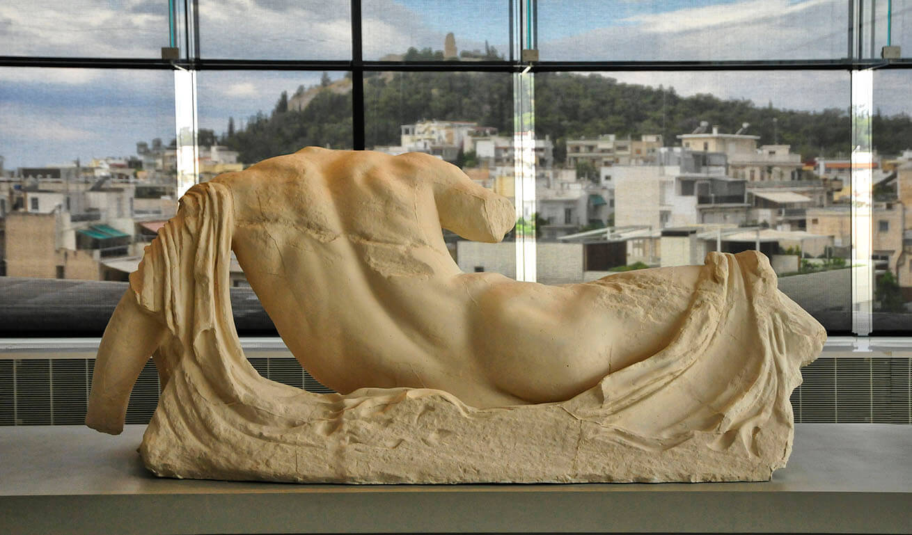 The Museum’s exhibition culminates on the third floor, in the glass-encased “Parthenon Gallery”. The relief sculptures of the Parthenon frieze depicting the Panathenaic procession are exhibited in continuous sequence along the perimeter of the external surface of the rectangular concrete core of the Gallery. The metopes, the marble slabs with relief representations from Greek mythology, are exhibited in between the stainless steel columns of the Gallery, which are the same in number as the columns of the Parthenon. The colossal figures of the two pediments have been placed on pedestals on the east and west sides of the Gallery. The east pediment depicts the birth of the Goddess Athena, emerging from the head of her father Zeus, and the west pediment depicts the battle between Athena and Poseidon over the land of Attica.