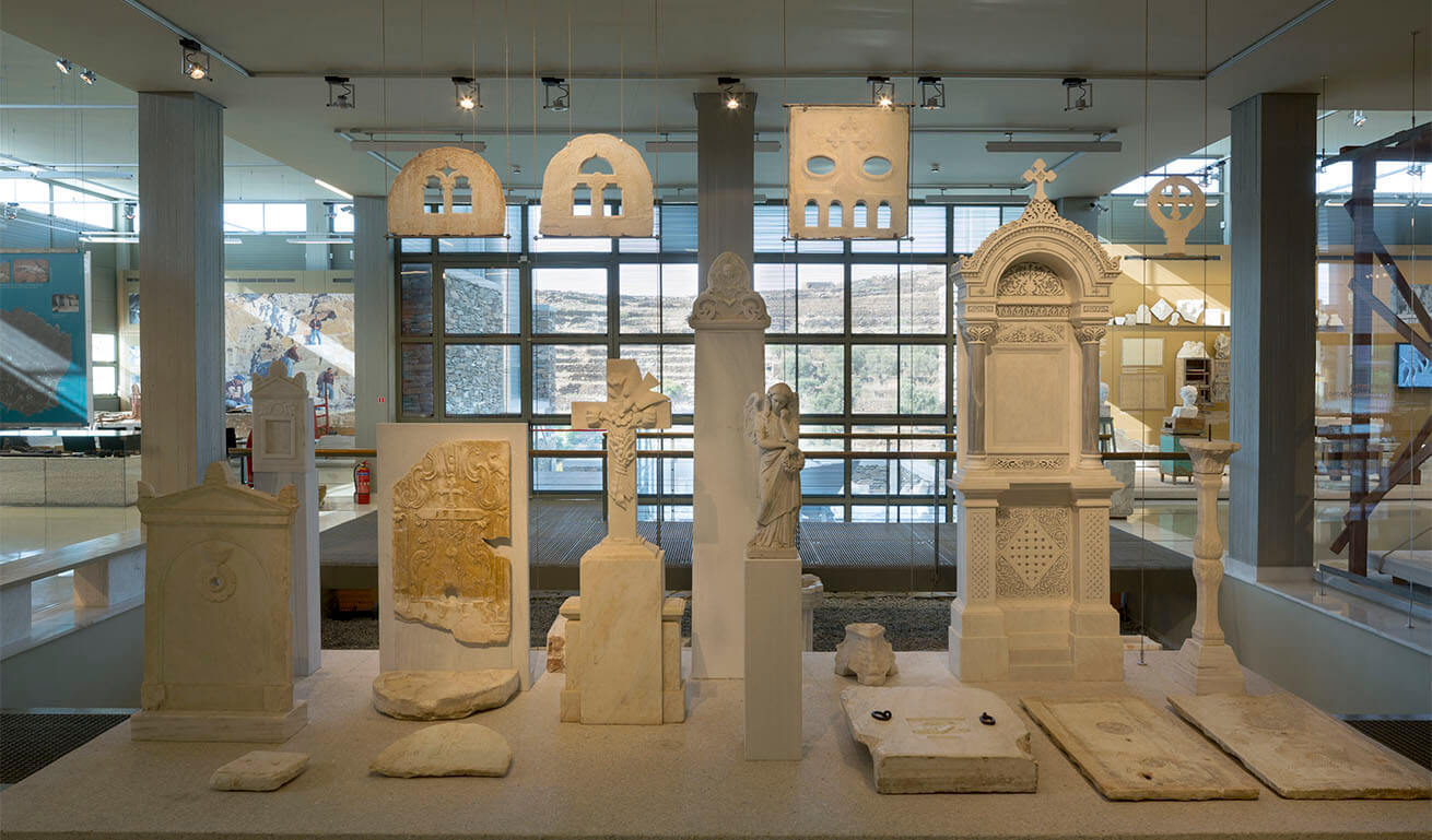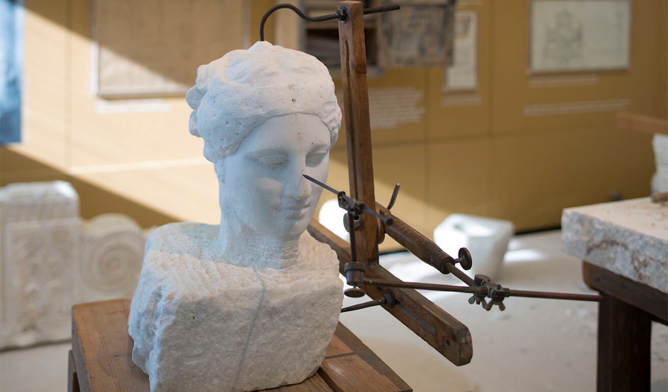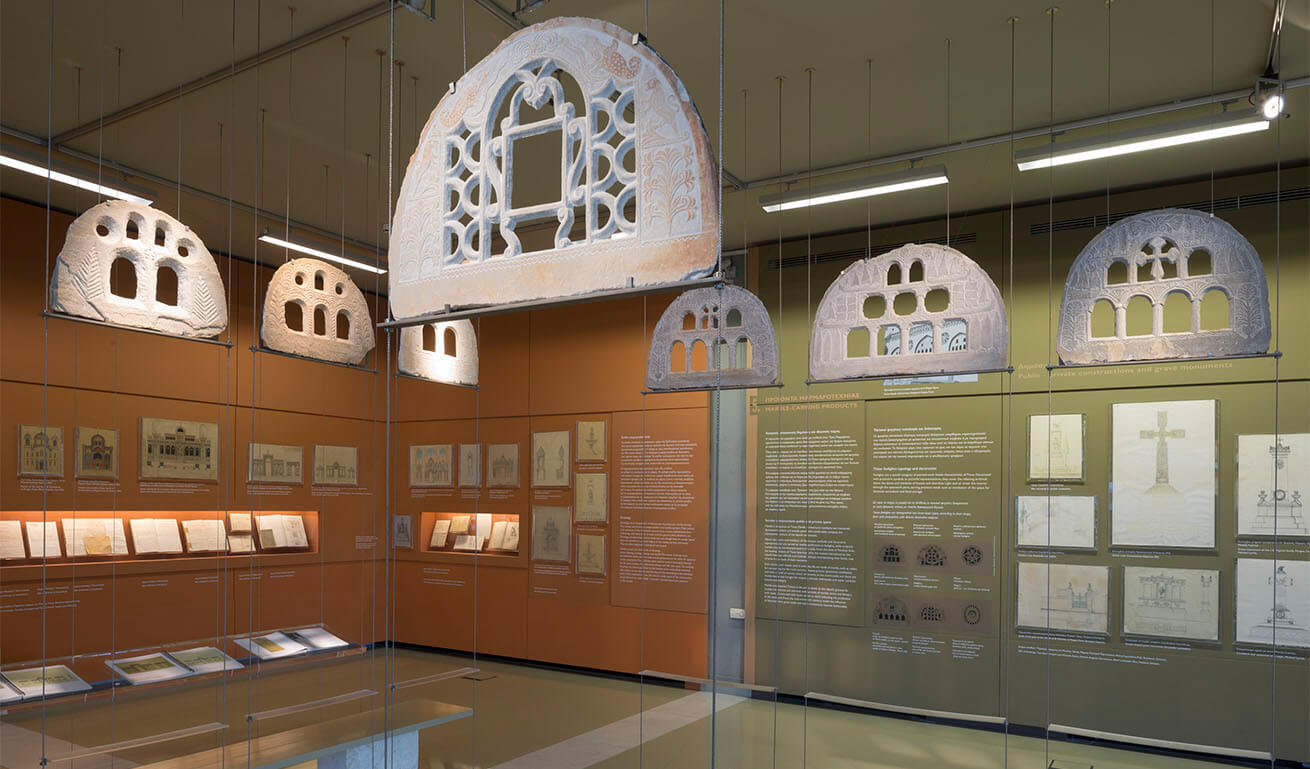 While visiting the museum, you could see first hand an impressive number of authentic objects, such as secular, ecclesiastical, funerary and everyday objects made of marble (door lintels, fountains, family crests, corbels, shrines, mortars, etc.), clay models and plaster of Paris copies, quarrying, cutting and carving tools, mechanical equipment, archival material, sketches of old marble carvings by master craftsmen (the richest collection in Greece).