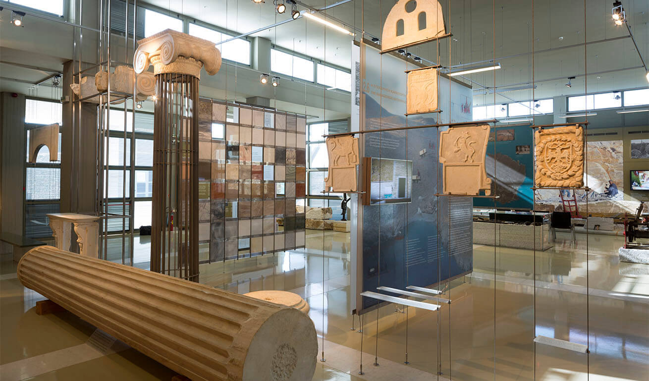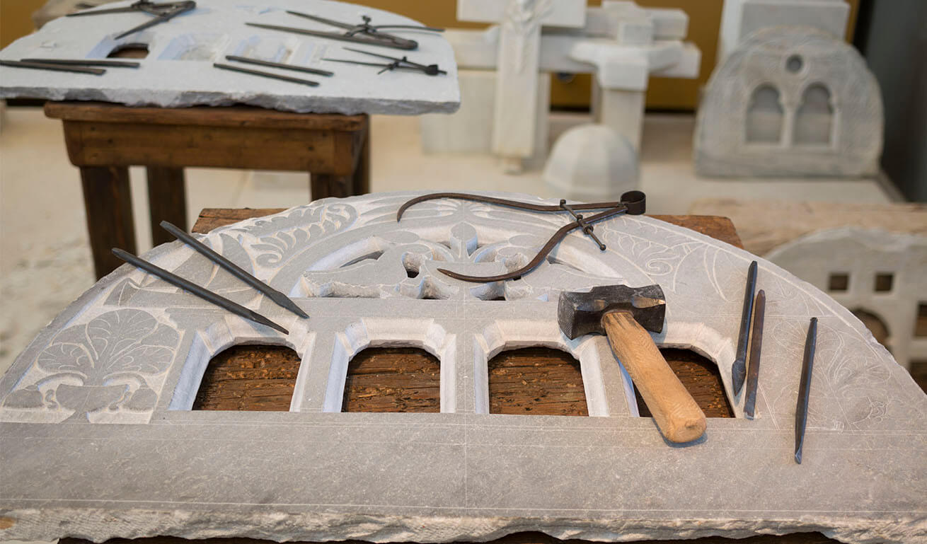 The exhibits are flanked by interconnected representations of a quarry, of a marble-craft workshop and the assembly/positioning of a bishop's throne. The exhibition's audiovisual material brings to life the traditional work methods of the quarryman and the marble craftsman.