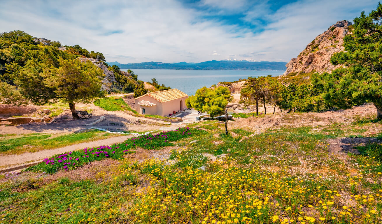 At a short distance from Loutraki, which is renowned for its healing and natural mineral waters, you will encounter the cape of